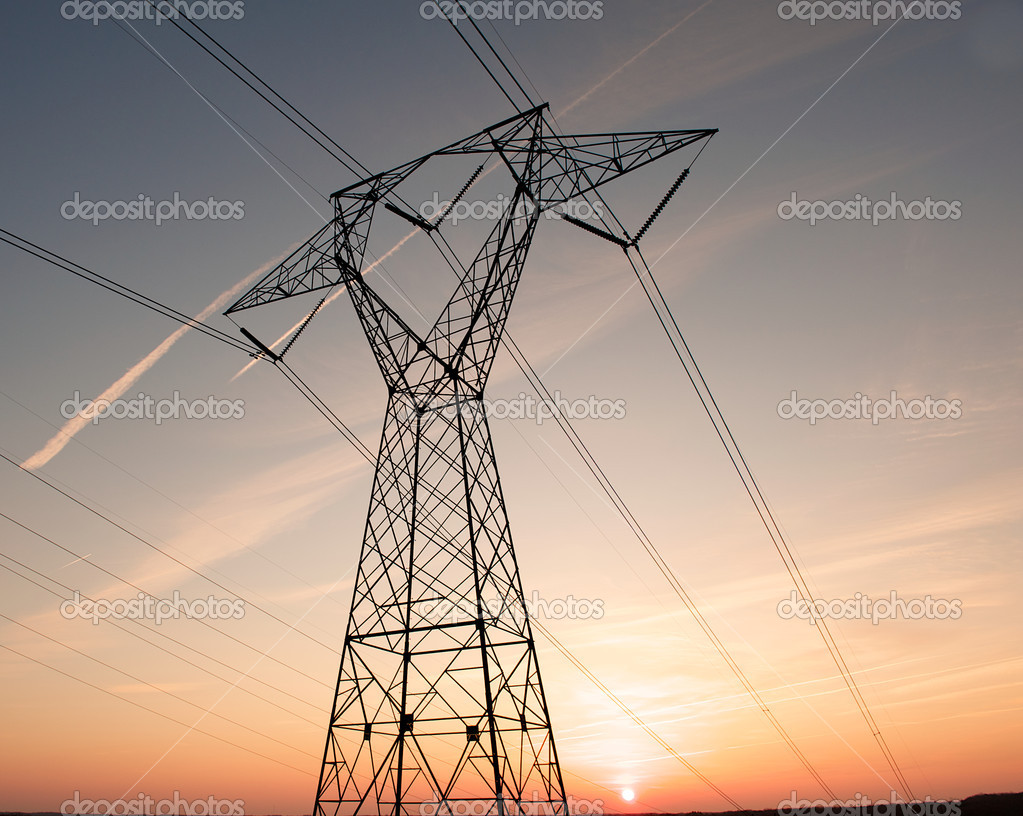 Electric power pylon and wires silhouetted by ab colorful sunset.