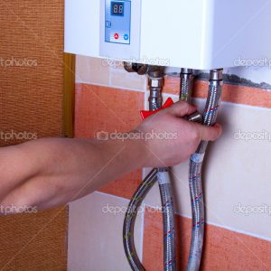 man tests the reliability of fastening of pipes in water heater